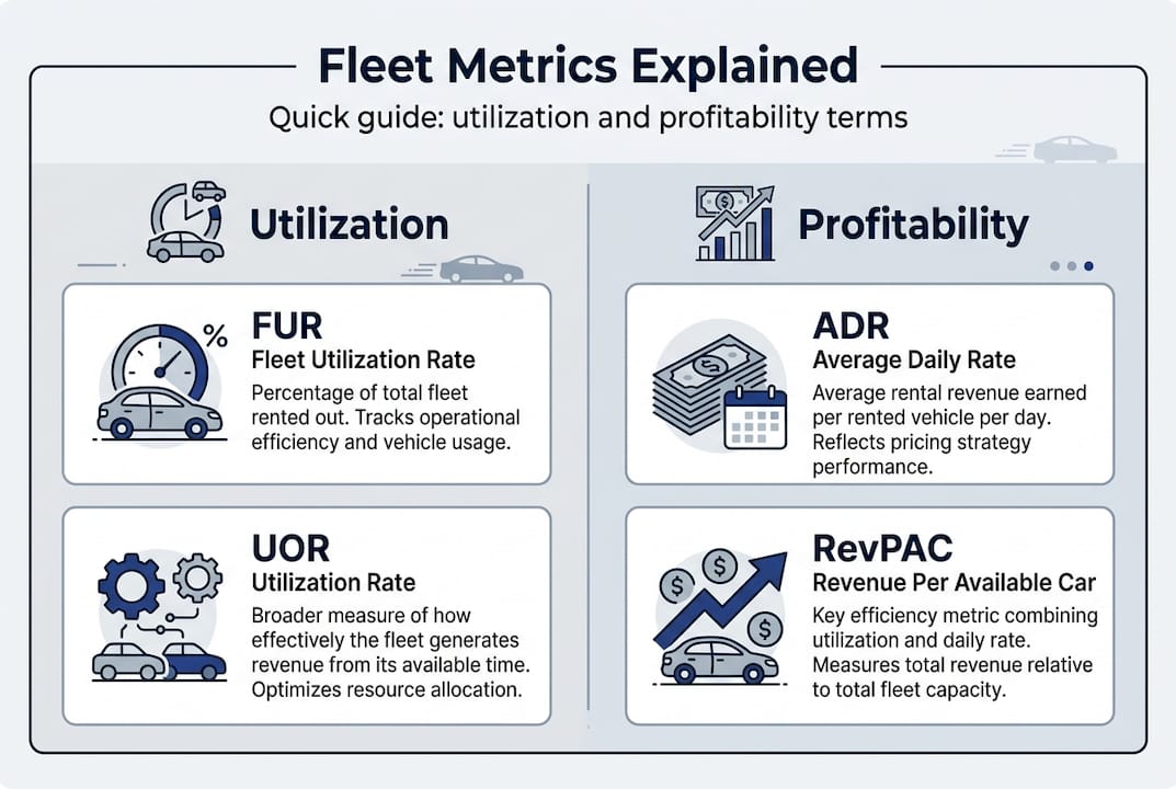 Three metrics sit at the center of every profitable car rental business: Fleet Utilization Rate (FUR), Average Daily Rate (ADR), and Revenue Per Available Car (RevPAC). Understanding each one individually is useful, but understanding how they interact is where real operational insight comes from.