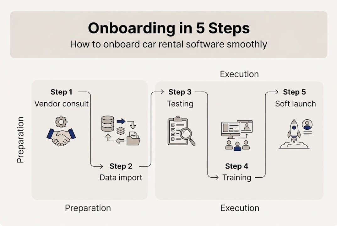 Switching to new rental management software should feel like upgrading your engine, not blowing a tire at full speed. Yet many small and mid-sized car rental businesses discover, often too late, that a rushed or poorly planned onboarding process creates exactly the problems they were trying to solve. Double-bookings and initial chaos are among the most common consequences of under-tested software launches. This guide gives you a clear, step-by-step onboarding framework so you can move from your old system to a fully integrated rental platform without losing revenue, customers, or your team's confidence along the way.