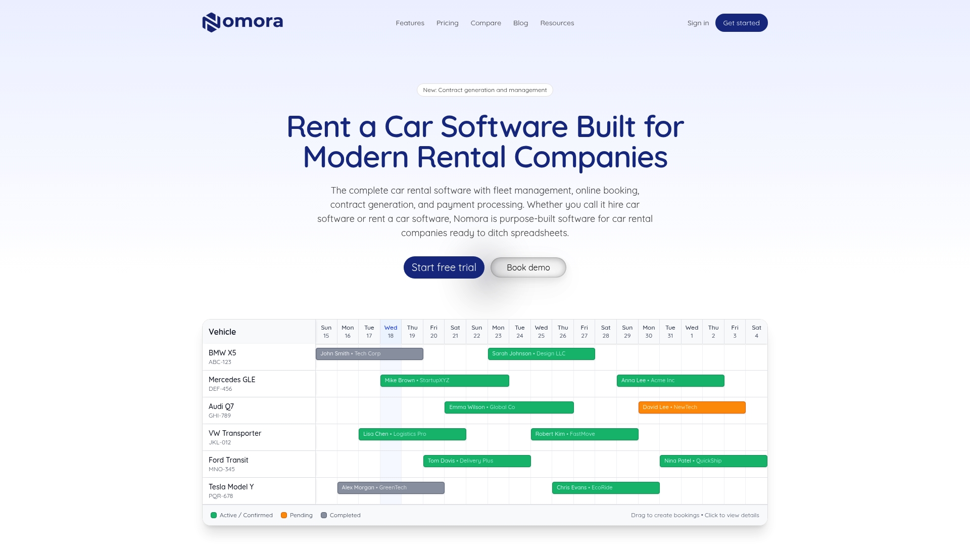 Nomora centralizes reservations, fleet status, contract generation, and payments in one platform so your team stops toggling between tools. Key features include real-time availability with conflict detection, e-signature contracts, GPS tracking integration, and a white-label booking portal for brand consistency.