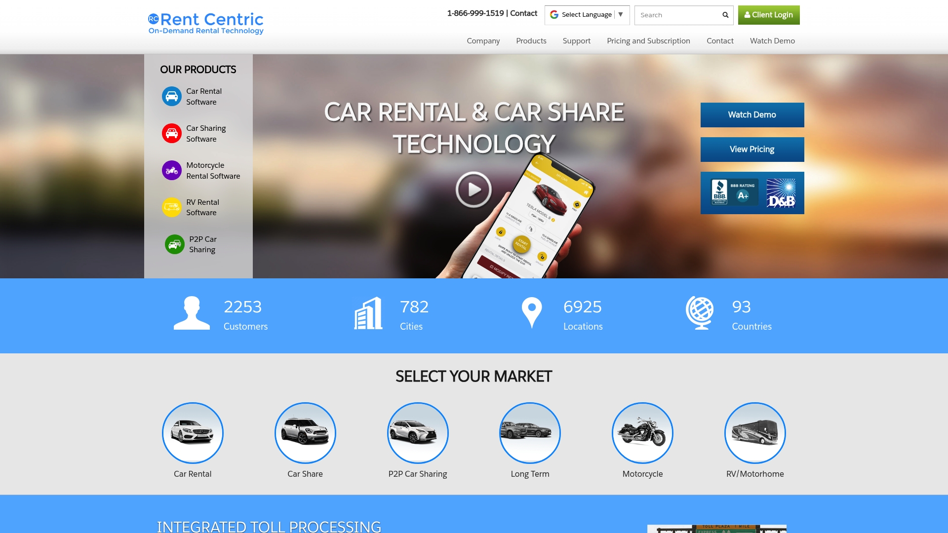 The platform offers vehicle rental management automation, support for multiple rental types, integrated toll processing, and WordPress integration for custom websites. A mobile agent app handles on the go check in and check out and the system includes fleet monitoring and GPS tracking.