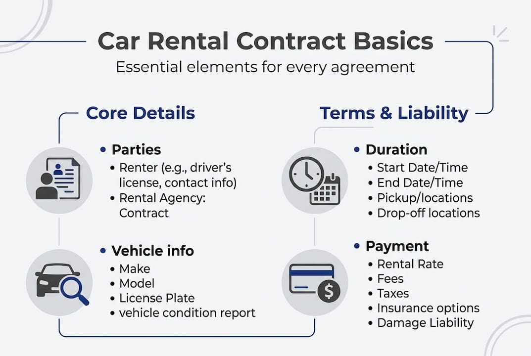 Car rental contracts must include core elements: parties involved, vehicle details, rental duration, payment terms, liability provisions, prohibited uses, insurance requirements, and fees. Each of these sections serves a distinct protective function. The vehicle details section, for example, establishes the baseline condition of the car before the renter takes possession. Payment terms prevent billing ambiguity. Liability provisions define who is responsible when something goes wrong.